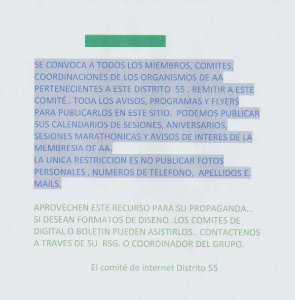 EXPERIENCIA COMPARTIDA LOCAL Las necesidades y la experiencia de A.A. locales determinarán la forma en que las comunicaciones de A.A. se desarrollen en nuestra época electrónica. Si tienen dudas o